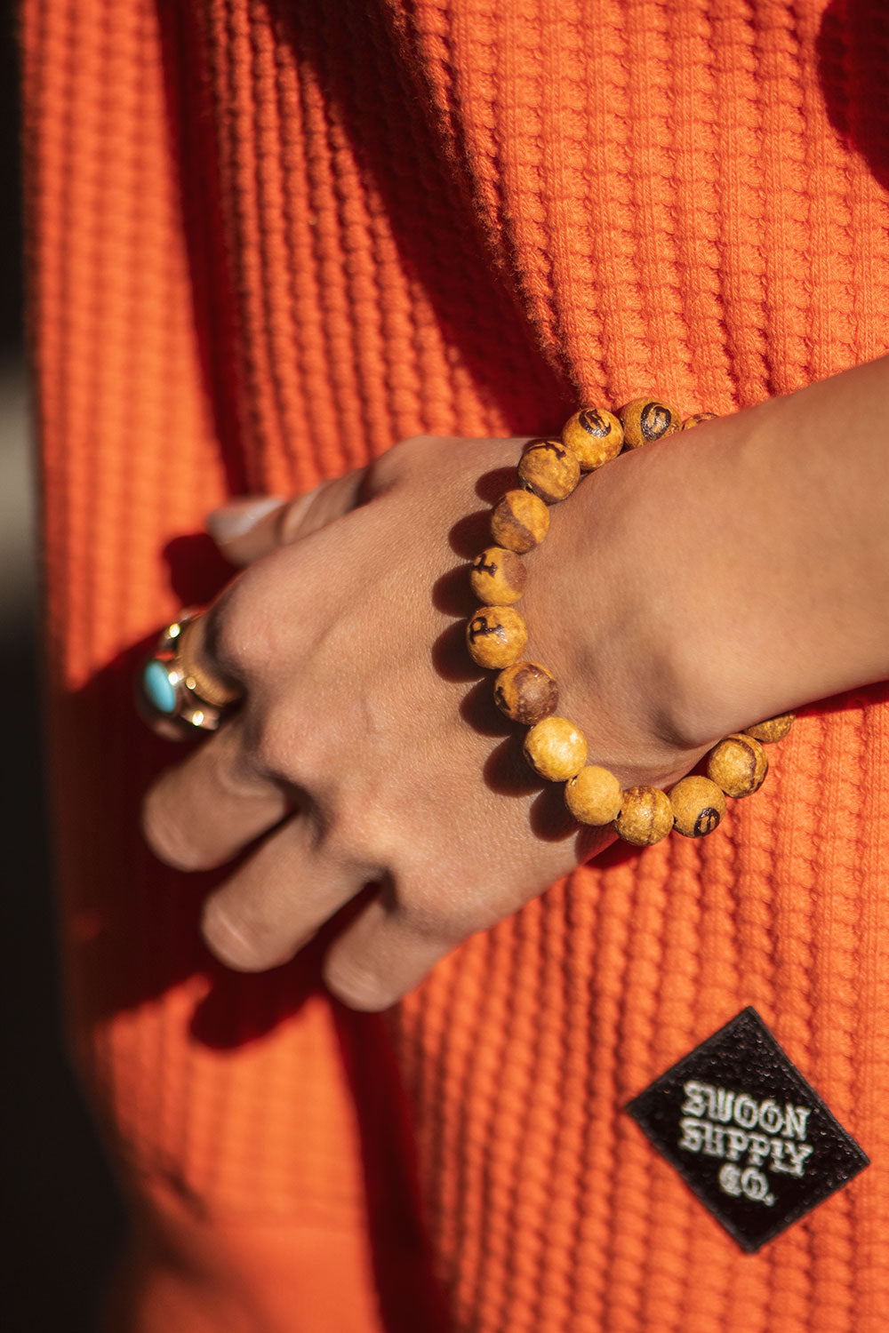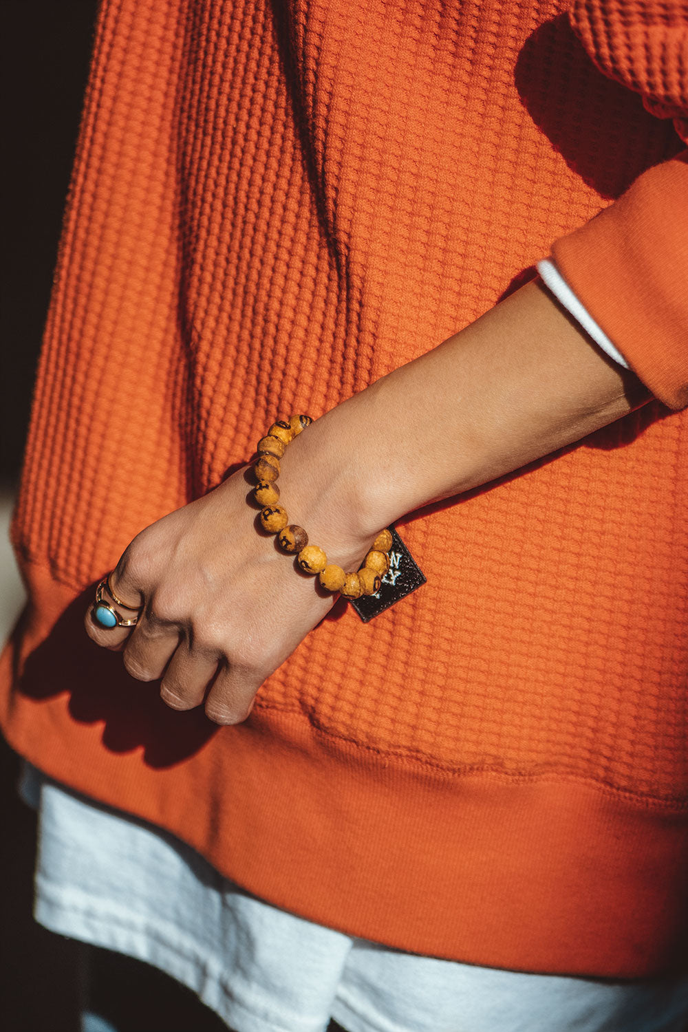 ほんのり香るパロサントの香りが、身につけるたびにリフレッシュしてくれます。ゴム仕様なので、メンズ用・レディース用ともにサイズ調整が可能。デイリーにも、特別なシーンにも、自分らしく取り入れてみてください。