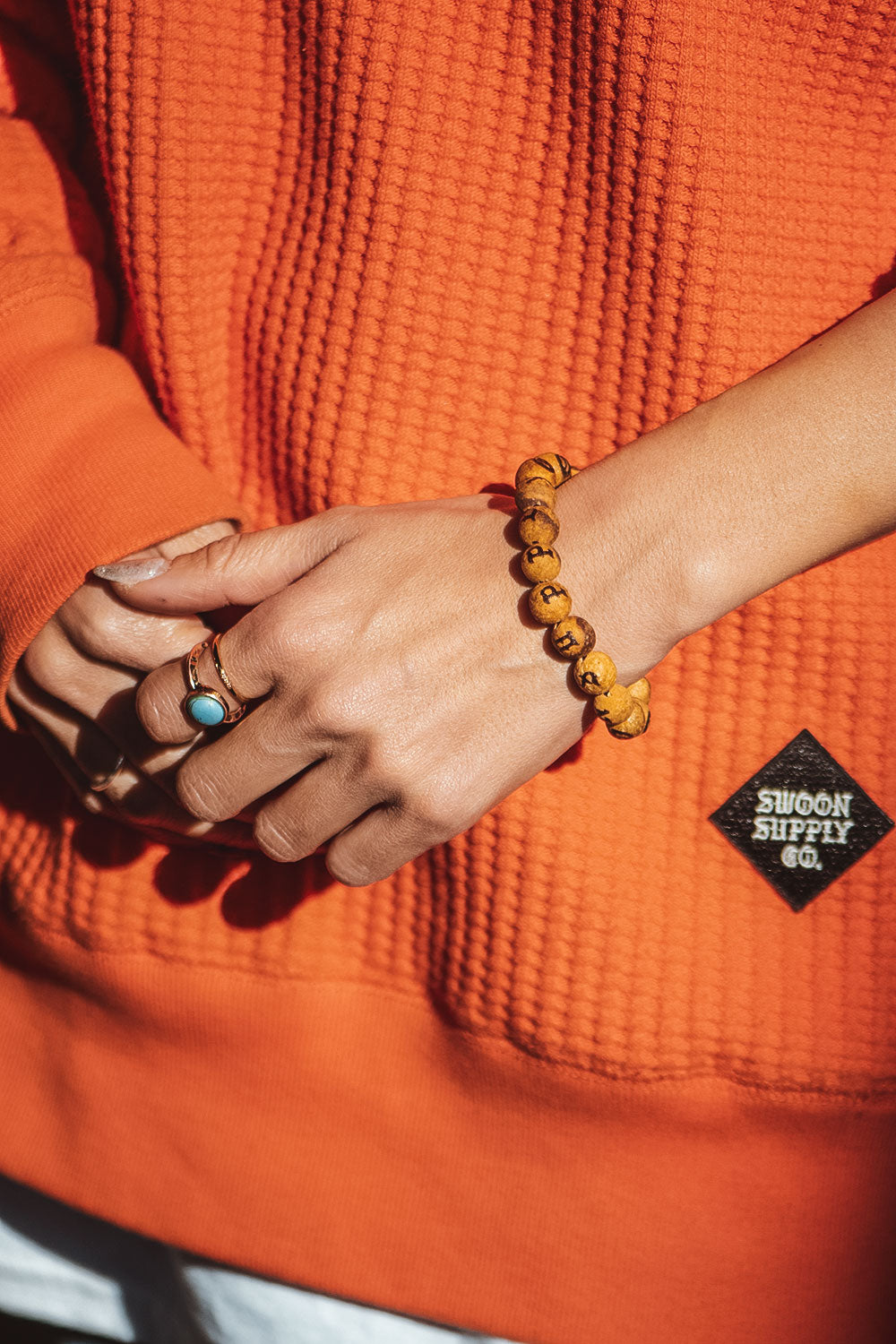 ビーズには「SWOON SUPPLY CO.」の文字をプリントし、シンプルながらも存在感のある仕上がりに。