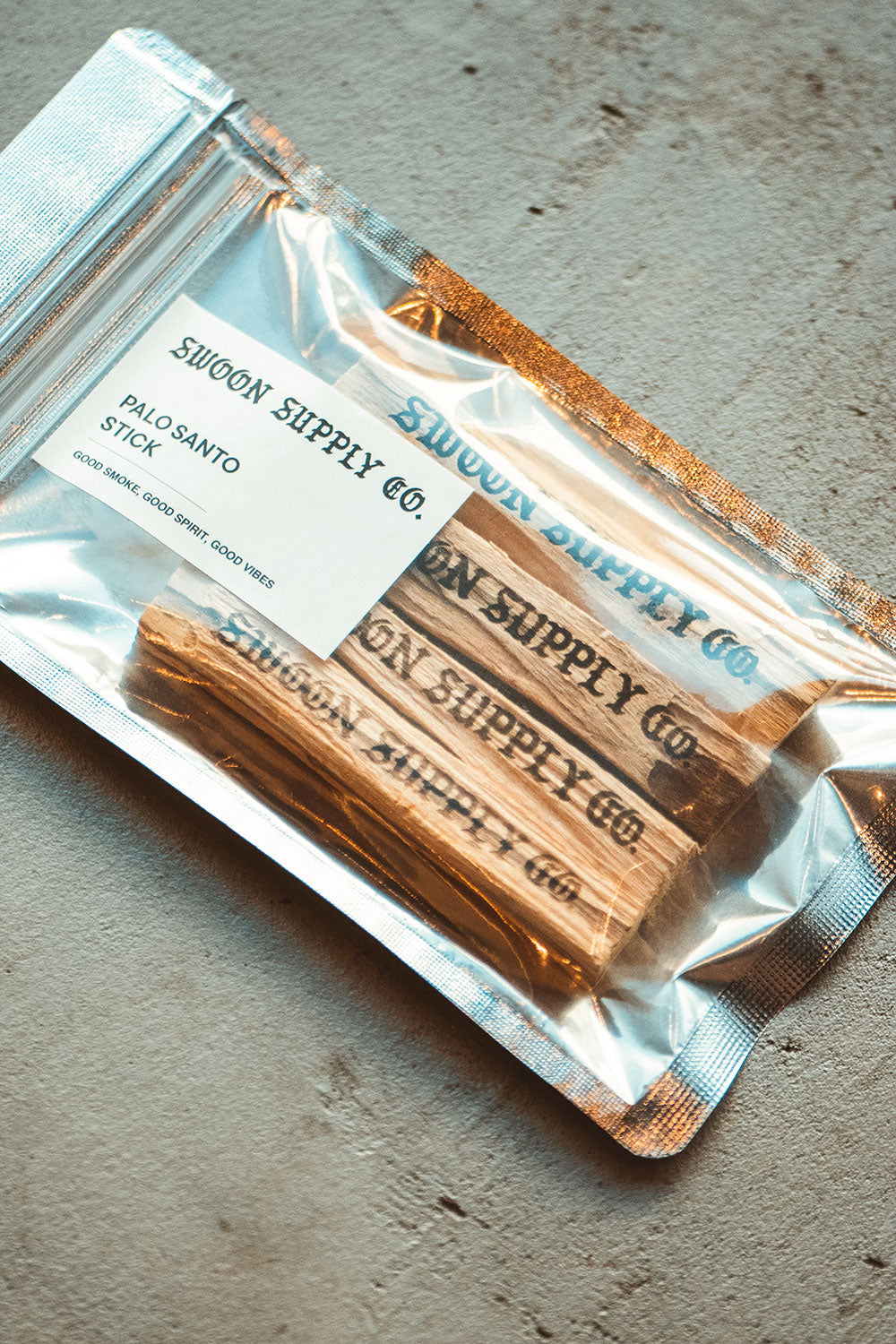 南米原産の神聖な香木「パロサント(聖なる木)」に、SWOON SUPPLY CO.のロゴを刻印したスティックタイプ。原木そのままの素朴な質感と、自然が生み出すやわらかな甘い香りが特徴です。